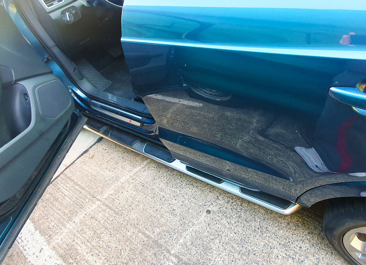 Kein Problem, in dem Fall können Sie diese Toleranzen mit großen Unterlegscheiben zwischen dem Chassis und den Halterungen ausgleichen und so die Trittbretter ganz genau parallel zu den Türschwellern montieren.