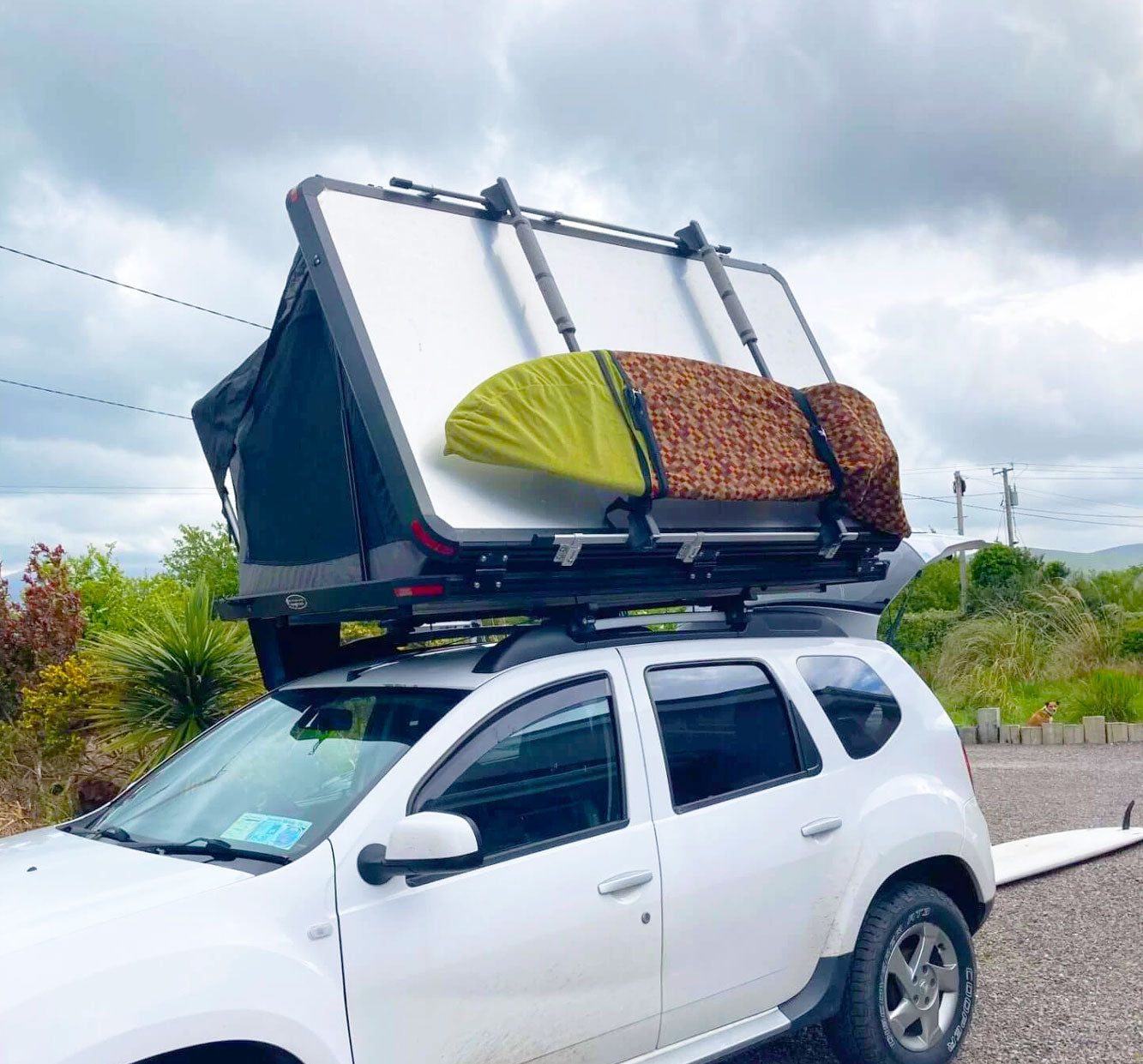 Das "Adventure" Tour Dachzelt kann Dank dem speziellen Design und seiner gewichtssparenden Konstruktion, auch auf kleinen Personenkraftwagen problemlos montiert werden. Bei dem Design und der Konstruktion wurde bewusst auf Qualität geachtet, sodass der Rahmen, die Bodenplatte, die Hydraulik / Gasfedern eine maximale Zuverlässigkeit und Robustheit bieten und zugleich eine höchstmögliche Gewichtsersparnis erzielen. Das "Adventure" ist das Schalenzelt, welches komfortable Bewohnbarkeit sowie schnelles Öffnen und Schließen miteinander vereint. Einfach die 4 Verschlüsse öffnen und das Schalenzelt "Adventure" ist in nur 1 Minuten von nur einer Person einsatzbereit. Mit dem "Adventure" Autodachzelt wird jeder Ausflug, Euere nächste Reise, oder Expedition zum absoluten bequemen Erlebnis. Das "Adventure" ist äußerst robust und bietet zudem eine bequeme Handlichkeit.Das geniale an unserem "Adventure" Schalenzelt ist ebenfalls die Reling rechts und links. Hier können Ihr problemlos Kanus, Surfboards, Fahrräder, oder Ihre Ski befestigen und transportieren und das Dachzelt noch einmal mit bis zu 100kg belasten.