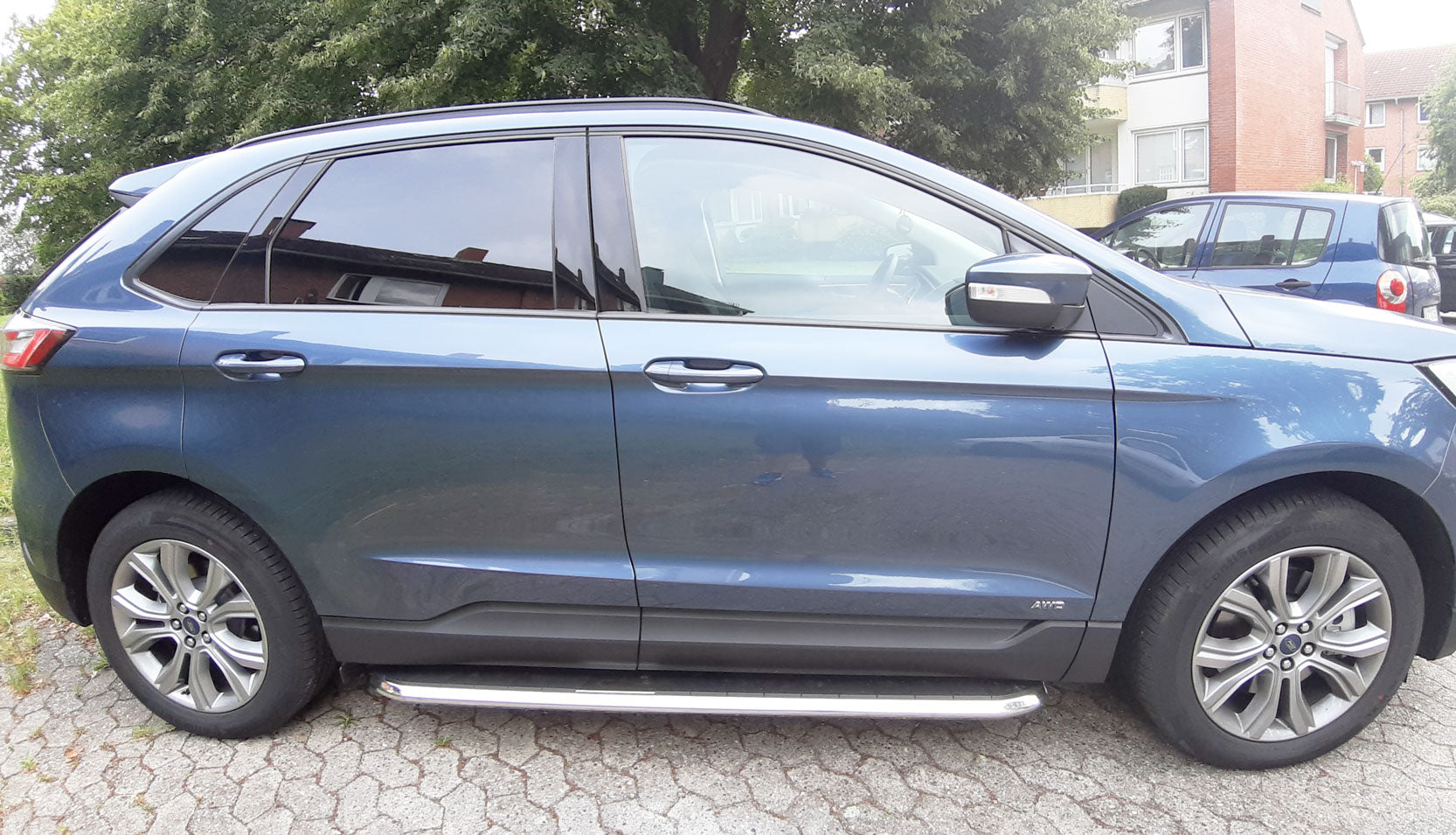 Diese hochwertigen Aluminium Trittbretter werten das Erscheinungsbild Ihres Ford Edge ab Bj. 16 noch einmal auf und ermöglichen einen leichteren Zugang zu Ihrem Fahrzeug, sowohl zum Ein- und Aussteigen, als auch um ans Dach zu gelangen. Diese Trittbretter bieten ebenfalls guten Schutz vor Kratzern und Beulen durch andere Autotüren. Hergestellt aus hochwertigen Materialien sind diese Aluminium Trittbretter ein Garant für Haltbarkeit und werden mit einem entsprechendem Gutachten für den Ford Edge ab Bj. 16 geliefert.