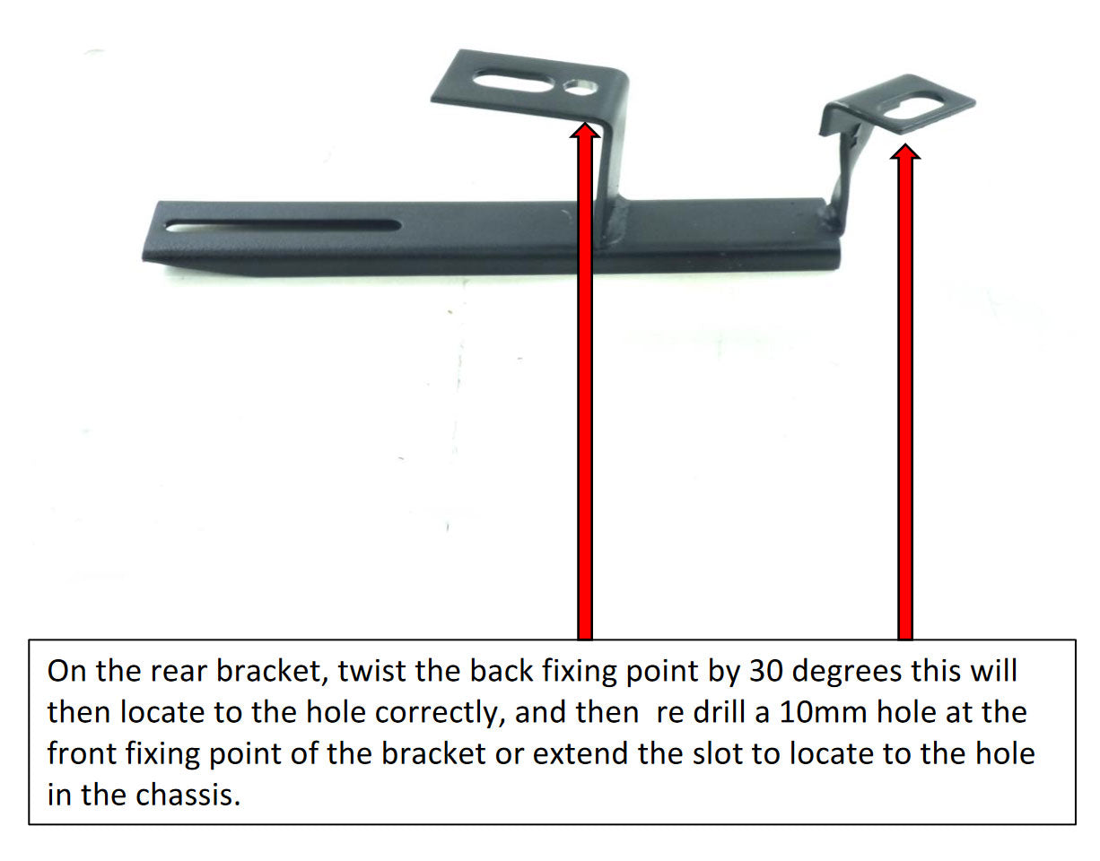 Bitte beachten Sie: Wenn Sie bei Ihrem E-Pace nur ein passendes Montageloch für die hintere Halterung vorfinden, drehen Sie bitte an der hinteren Halterung den hinteren Befestigungspunkt um 30 Grad um mit der Position des Montagepunktes im Chassis zu überein zu stimmen (siehe Foto). Bohren Sie dann ein 10-mm-Loch am vorderen Befestigungspunkt der Halterung erneut, oder Sie können auch den Schlitz einfach erweitern, um die Position des Lochs mit dem Chassis übereinstimmend zu machen.