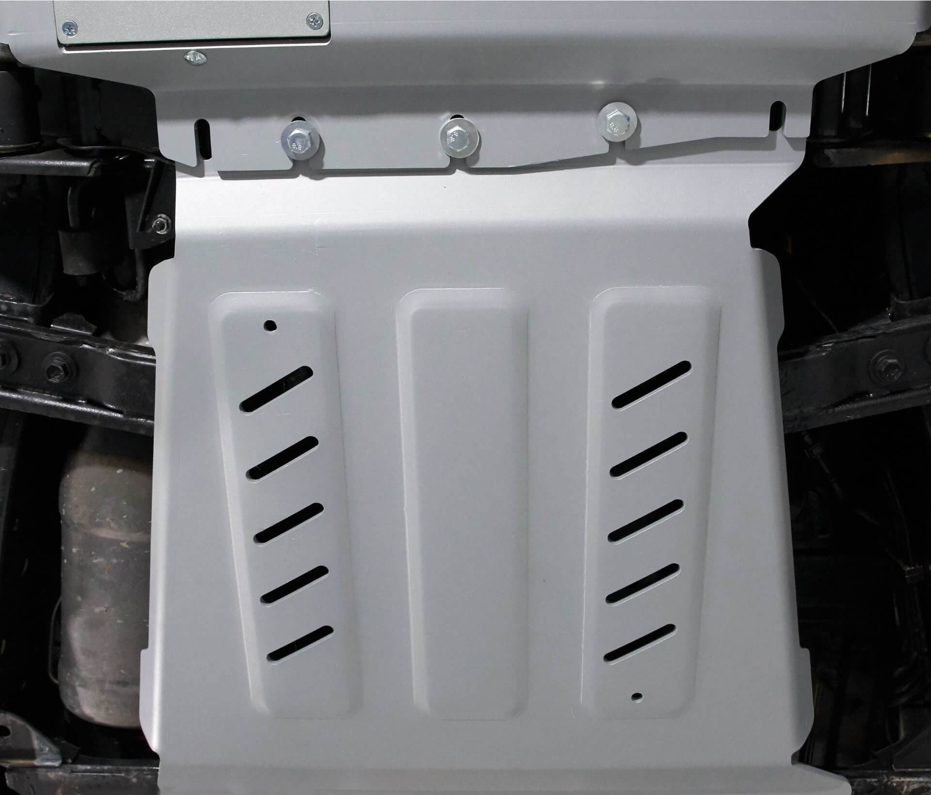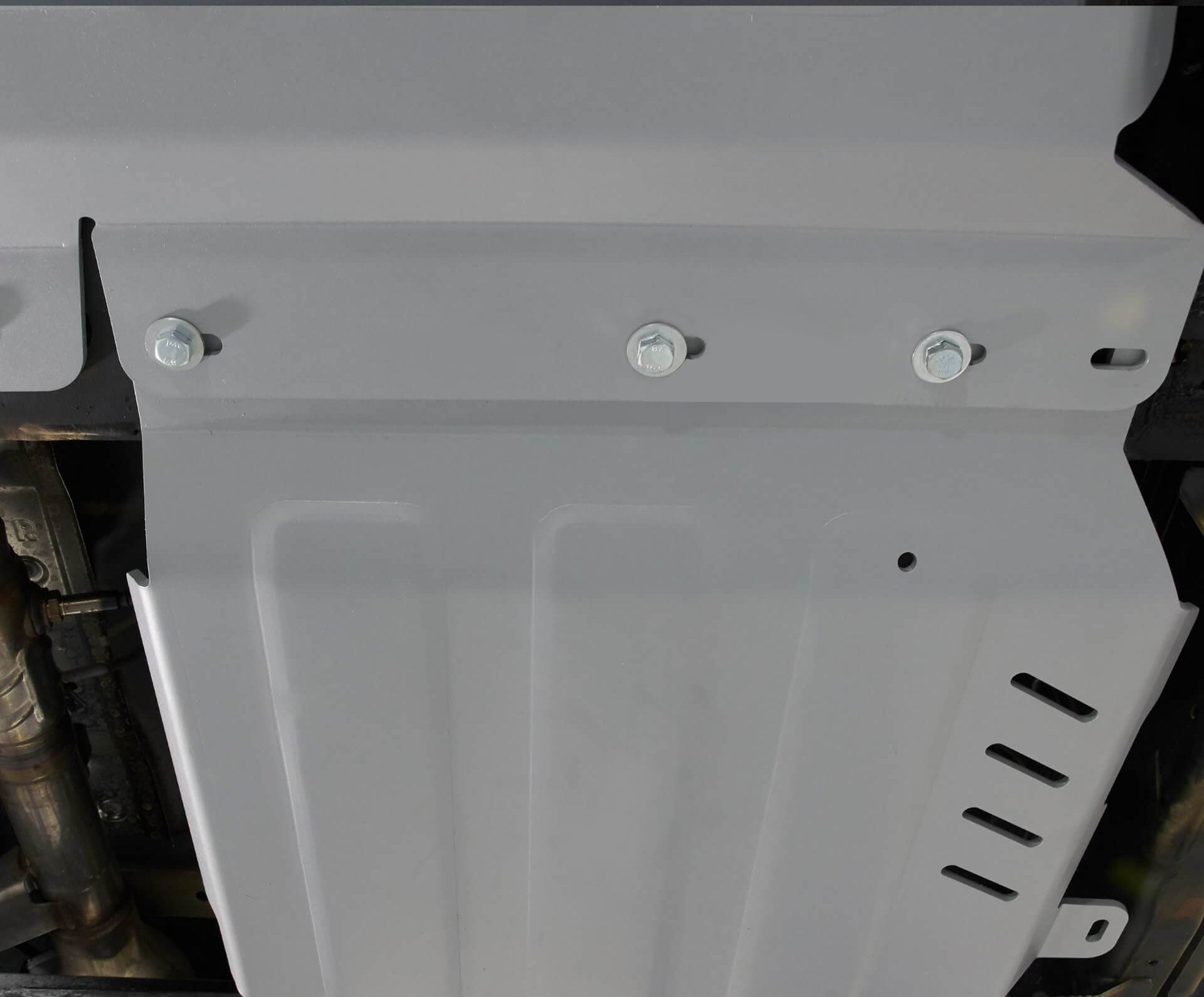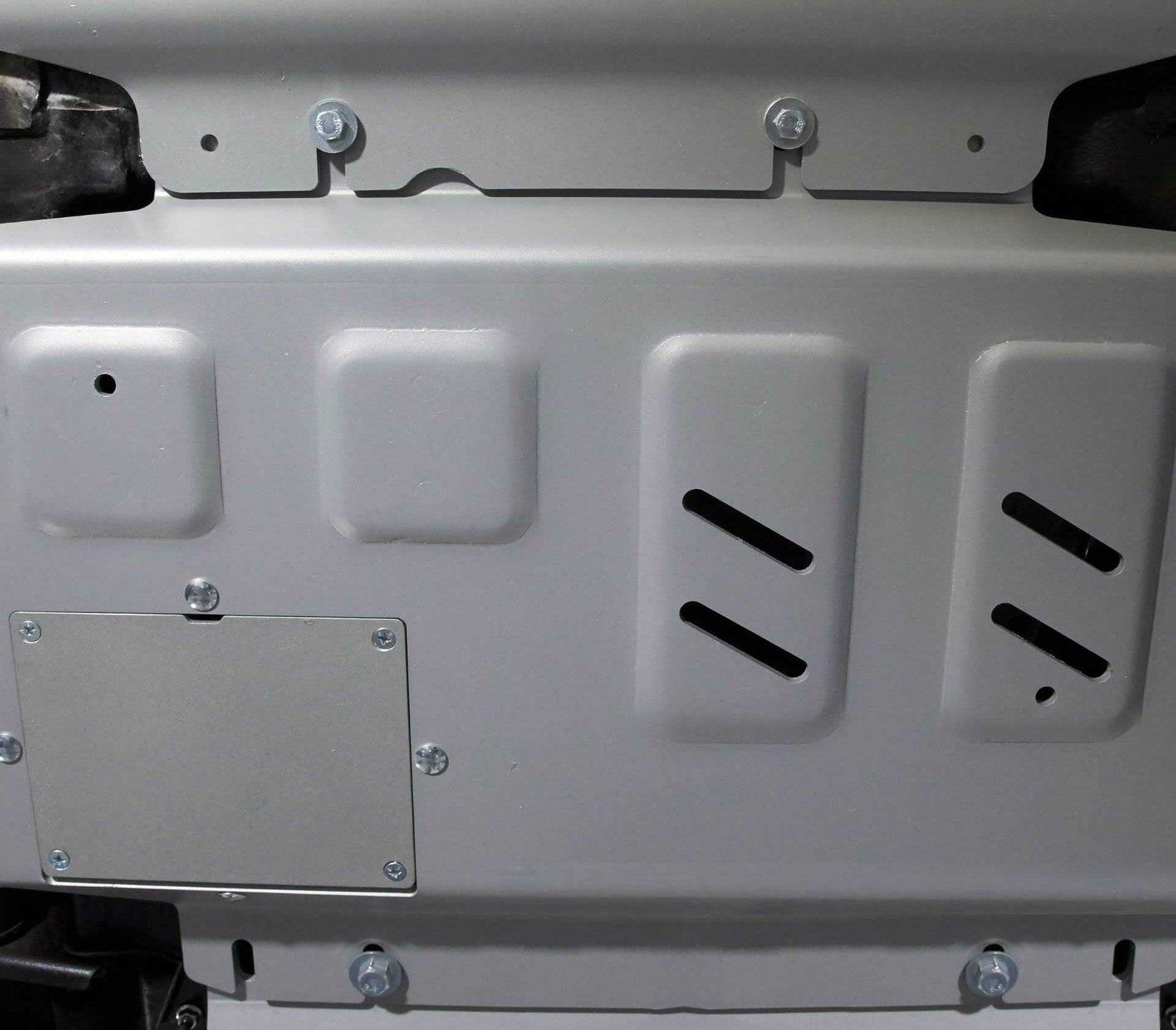 Alle Schraubpunkte, Lüftungs- und Wartungsausschnitte werden ebenfalls per Laser ausgeschnitten. Sofern Wartungsöffnungen, z.B. für Ölwechsel von Motor und Getriebe, vorhanden sind, werden die großformatigen Wartungsausschnitte stabil mit abschraubbaren Abdeckungen aus Aluminium verschlossen. Für ein wertigeres Aussehen und zusätzlichem Korrosionsschutz werden die Aluminium-Unterfahrschutz-Platten zudem nocheinmal zusätzlich pulverbeschichtet.