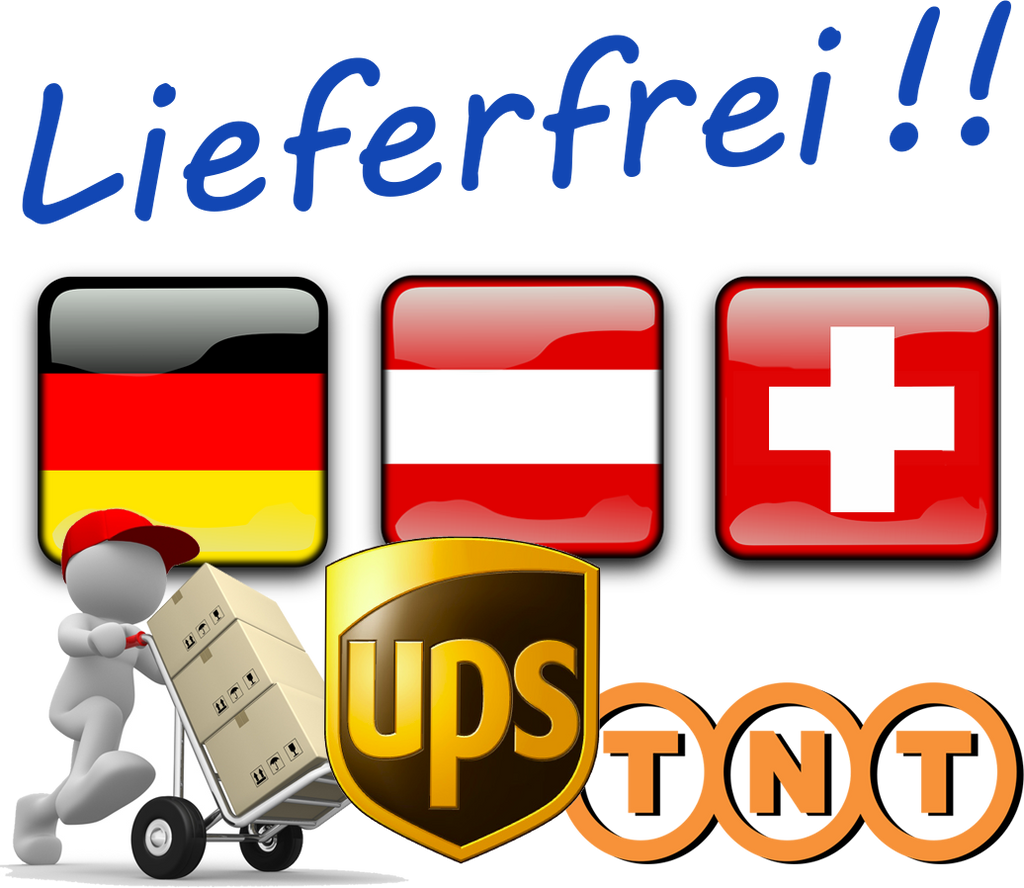 Wir liefern Ihnen alle unsere Artikel lieferfrei innerhalb Deutschlands, Österreich und in die Schweiz. Unsere angezeigten Preise sind Netto zu verstehen und es sind bei Auslieferung kundenseitig u.a. die MwSt., bzw. die Einfuhrumsatzsteuer zu entrichten.